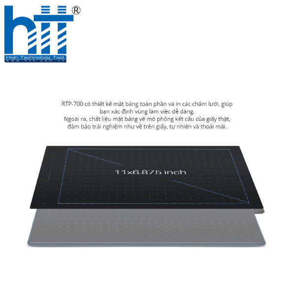 Bảng vẽ điện tử Huion RTP-700 được thiết kế với kích thước tổng thể 345.6 x 214.8 x 8.5 mm, trọng lượng chỉ 637g, mang lại cảm giác mỏng nhẹ và dễ dàng di chuyển. Với vùng hoạt động lên đến 279.4 x 174.6 mm (11 x 6.875 inch), thiết bị cung cấp không gian làm việc rộng rãi, thoải mái cho các thao tác vẽ tay, phác thảo, ghi chú hay chỉnh sửa hình ảnh.
