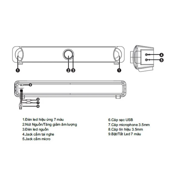 Bên hông được bố trí jack cắm tai nghe và micro tiện lợi dễ dàng kết nối tai nghe máy tính khi có nhu cầu sử dụng. Phía sau trang bị công tắc bật/tắt led cùng bộ cáp hỗ trợ kết nối với các nguồn phát như PC, Laptop.