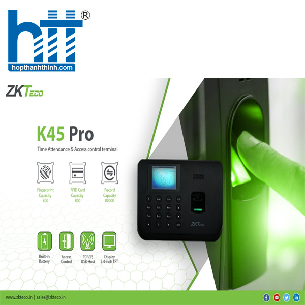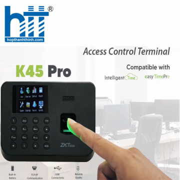 ZKTECO K45 Pro là máy chấm công có màn hình TFT 2,4 inch, chức năng chấm công & thiết bị đầu cuối kiểm soát truy cập đơn giản. Nó có thể kết nối với khóa cửa điện tử của bên thứ ba và nút thoát exit. Kết nối cổng TCP/IP và USB Host giúp quản lý dữ liệu cực kỳ hiệu quả. Quan trọng nhất, pin dự phòng tích hợp có thể loại bỏ sự cố mất điện. Với vẻ ngoài thanh lịch và chất lượng đáng tin cậy, bạn có thể nhận được những điều tốt nhất từ ZKTECO K45 Pro.