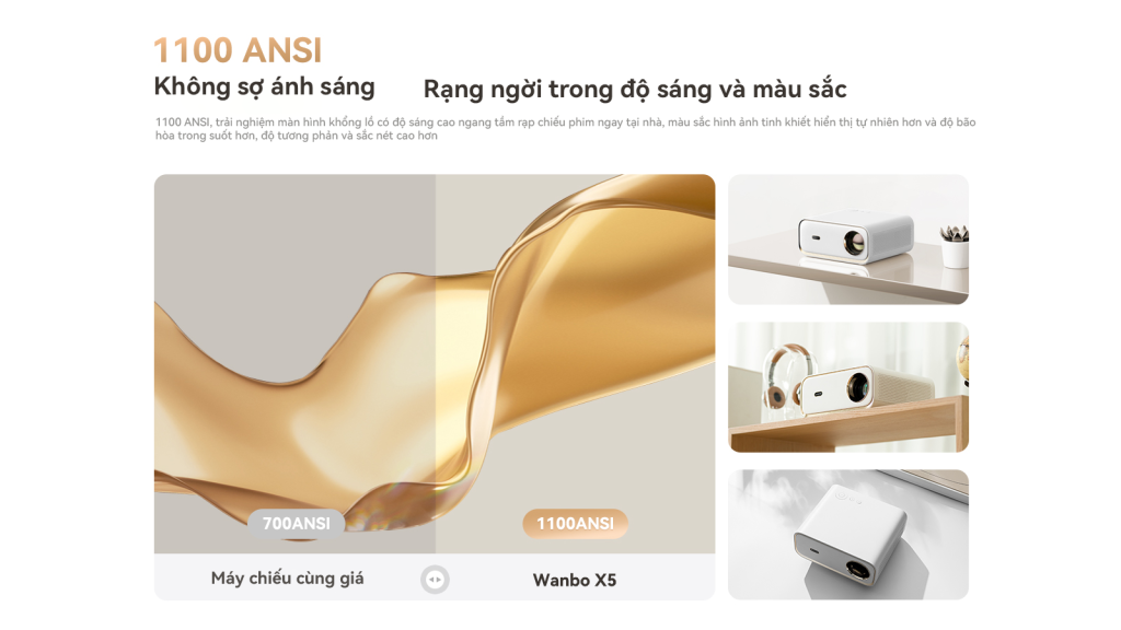 Với độ sáng lên đến 1100 Ansi, Wanbo X5 đảm bảo hình ảnh sắc nét và rõ ràng ngay cả trong môi trường có ánh sáng mạnh. Độ phân giải Full HD hỗ trợ video 4K mang đến trải nghiệm hình ảnh tuyệt vời với màu sắc sáng, tươi mới và chi tiết sắc nét.