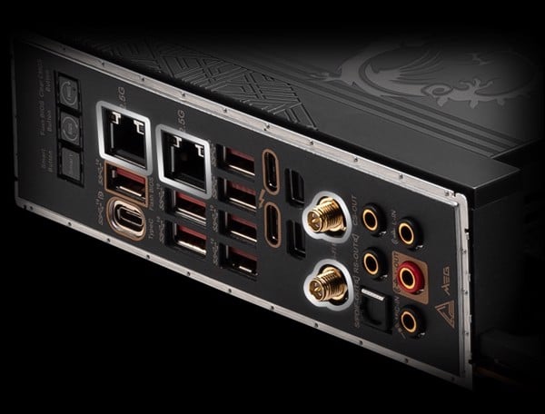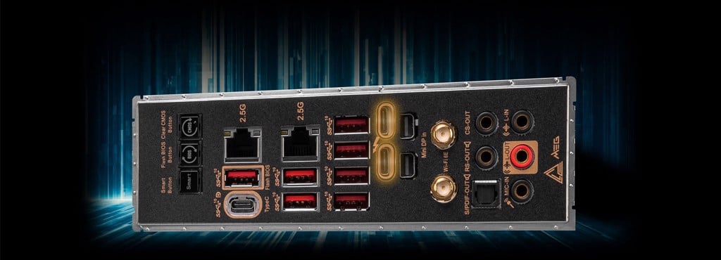 Không dừng lại đó, MSI MEG Z790 ACE cung cấp thêm 2 cổng Thunderbolt 4 với tốc độ cực đỉnh lên đến 40Gbps. Cổng Thunderbolt này giúp bạn kết nối với các thiết bị trình chiếu và hỗ trợ độ phân giải lên đến 8K trên những chiếc màn hình gaming.