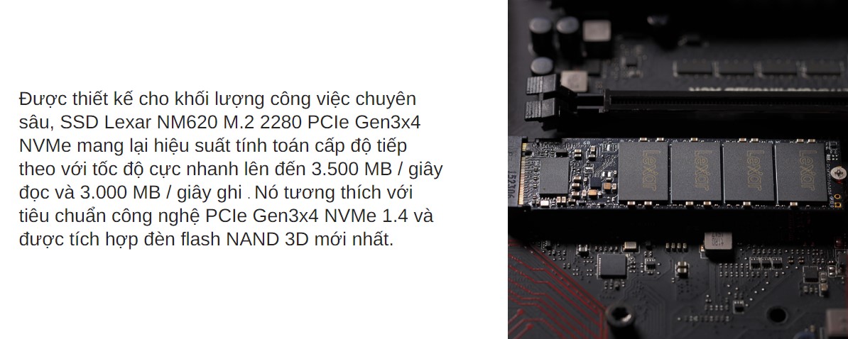 Ổ cứng SSD Lexar NM620 là dòng ổ cứng SSD kết nối M.2 chuẩn PCIE 3.0 của Lexar - thương hiệu chuyên các thiết bị lưu trữ nổi tiếng trên thế giới. Ổ cứng này phù hợp cho cả laptop và PC có hỗ trợ khe ổ cứng M.2