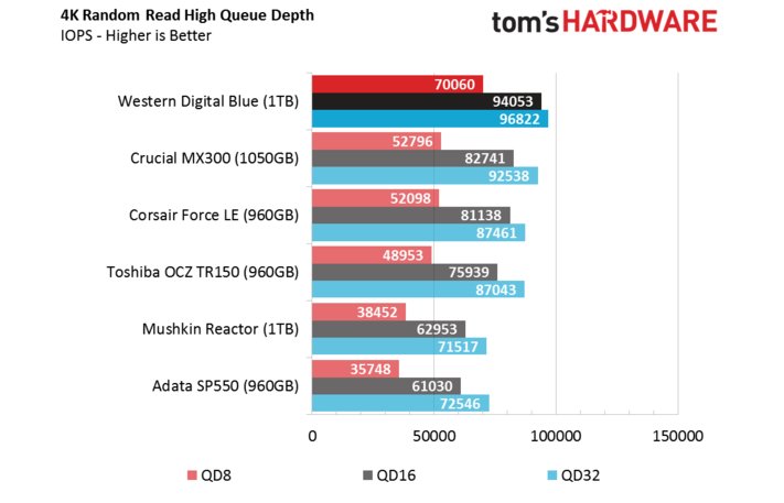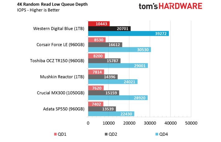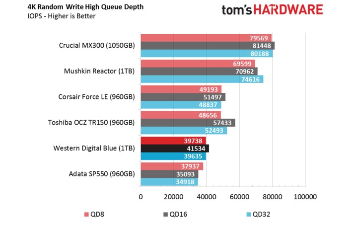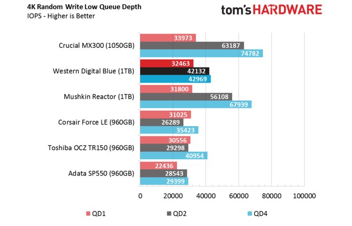 Sequential Read/ Write là một chuyện, nhưng với việc sử dụng hàng ngày, yêu cầu chuyển đổi các file với độ lớn không đáng kể, 4K mới là thang đo đáng lưu tâm. Nhìn vào kết quả đọc 4K Random, chúng ta có thể thấy được hiệu năng vượt trội SSD WD Blue thể hiện với 10.000 IOPS ở mức queue depth 1, chỉ Samsung 850 EVO là SSD TLC duy nhất đạt được mức hiệu năng cao này.