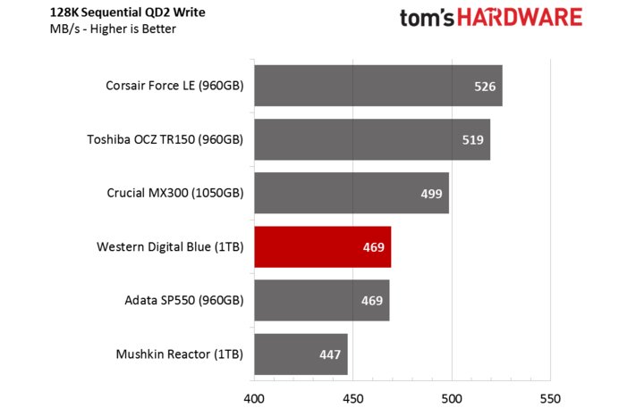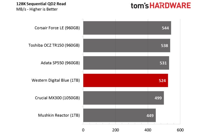 Mọi sản phẩm trong mẫu đánh giá đều thể hiện hiệu năng sequential read - chuyển đổi dữ liệu có dung lượng lớn, tuyệt vời. 3-bit cell TLC không gây nên bất kì trở ngại gì trong quá trình truy xuất thông tin từ flash ở tốc độ cao. SSD WD Blue dẫu có đứng tại vị trí thứ 4, cũng gây được ấn tượng rõ ràng khi thua kém từ 10-20MBps.