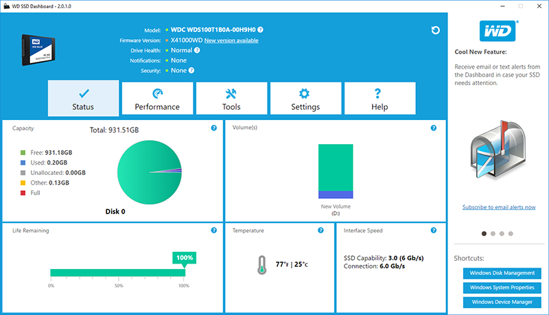 Rất nhiều thông tin hữu ích có thể được quan sát từ phần mềm này, từ trạng thái, hiệu năng cho tới tuổi thọ của sản phẩm. WD SSD Dashboard cũng là nơi mà người dùng có thể kích hoạt Trim support nếu lựa chọn ổ cứng này làm boot drive/ nơi cài đặt hệ điều hành chính.