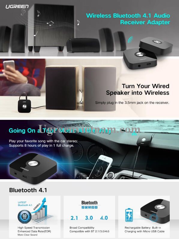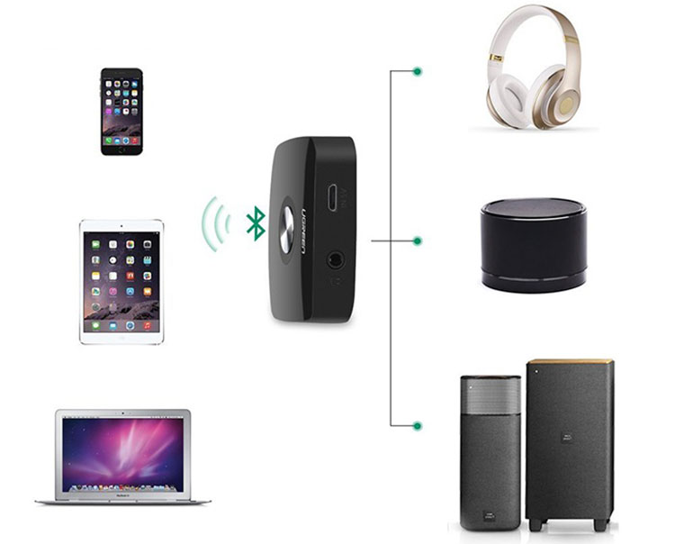Bluetooth receiver ugreen biến loa thường thanh loa không dây, phát nhạc nhanh chóng từ điện thoại ra âm ly rất dễ dàng. Sản phẩm đem lại sự tiện dụng cho bạn trong khi chất âm ra loa hầu như không thay đổi.