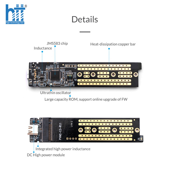 Hỗ trợ SSD: M.2 M KEY SSD (NVME protocol). 2230,2242,2260 và 2280 M.2 NVME SSD. Giao diện đầu ra: USB3.1 Type-C. Tốc độ: USB3.1 GEN2 10Gbps. Dung lượng tối đa: 2TB. Chip điều khiển JMS583, giao thức UASP, giao thức PCI-e. Tản nhiệt cao cấp, Chế độ ngủ tự động sau khi không sử dụng trong 10 phút